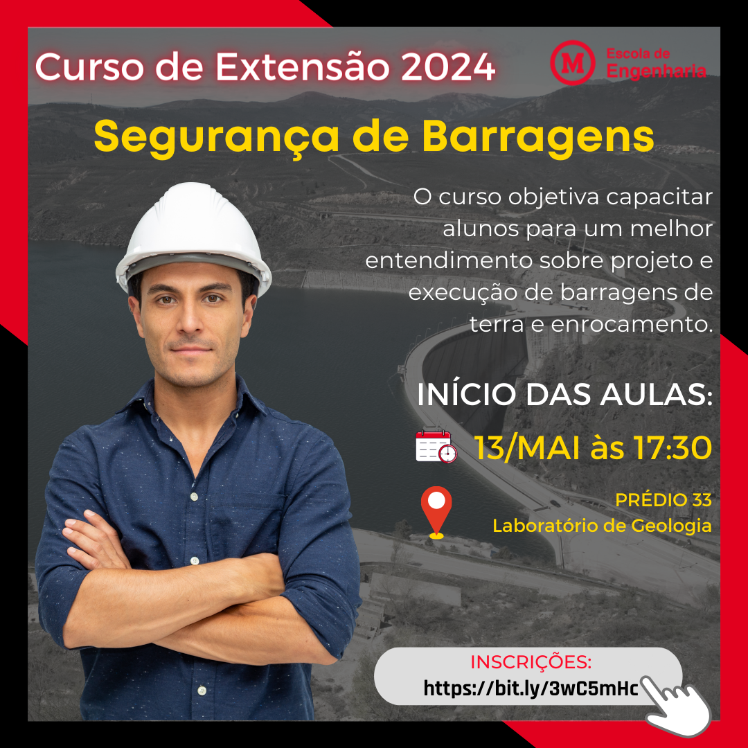 DESCRIÇÃO: Descrição dos principais tipos de barragens de terra e enrocamento, elementos de investigação geotécnica (campo e laboratório) para elaboração dos projetos, elementos constitutivos de uma barragem, estudos de estabilidade e percolação, verificação do desempenho, requisitos de segurança e principais patologias. O curso proposto visa ampliar os fundamentos e conhecimentos ministrados nos componentes curriculares "Geologia de Engenharia" e "Obras de Terra" do curso de Engenharia Civil.